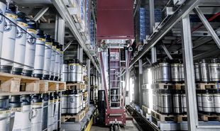Westfalia entwickelte und realisierte für die Brauerei als Generalunternehmer ein räumlich und ökonomisch passgenaues automatisches Lagersystem in Silobauweise für Dosen, Einweg- und Mehrwegflaschen, KEG-Fässer, Verpackungsmaterial, Handelsware und Brauerei-Werbeartikel mit 7003 Regalplätzen auf neun Ebenen. Alles wird für den maximalen Durchsatz auf bis zu einer Tonne schweren Euro- oder Industriepaletten transportiert, darunter auch bis zu 2,45 m hoch beladene ORBIS-Paletten. Die gelangen mit 2500 Leerdosen zunächst in ein separates Blocklager, von hier dann zu den Produktionslinien. Erst als Vollgut werden die Dosen auf Europaletten gestapelt und in das eigentliche Hochregallager befördert. Die 130 Meter lange Gesamtanlage und das neue, knapp 22 Meter hohe Hochregallager wurden auf rund 1500 Quadratmetern nahtlos in die bislang manuelle Intralogistik integriert – manuell sind jetzt nur noch Paletten-Aufgabe, Mischpaletten-Kommissionierung und LKW-Beladung.