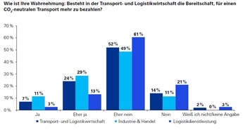 Das Dilemma vieler Unternehmer und Management-Entscheider: Ihrer Wahrnehmung nach besteht offenbar keine oder nur geringe Bereitschaft in der Transport- und Logistikwirtschaft, für einen CO2-neutralen Transport mehr zu bezahlen. Noch deutlicher fallen die Einschätzungen aus, wenn es darum geht, längere Lieferzeiten oder andere Serviceeinbussen in Kauf zu nehmen.